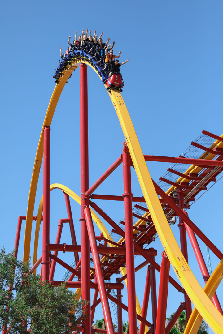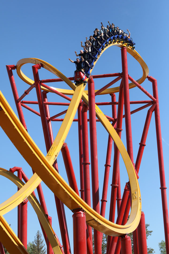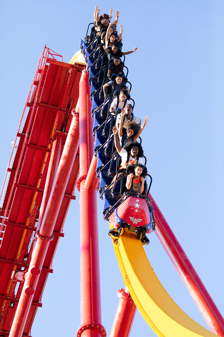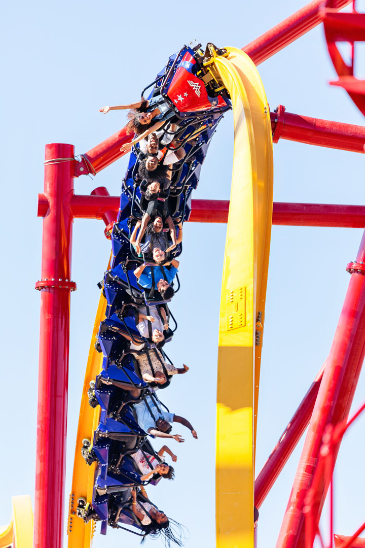 yellow, it joins other superhero-named rides as DC’s most popular female superhero. The coaster reaches speeds of 58 mph after dropping at 87 degrees. Wonder Woman really shows her strength with three dramatic inversions, including a 180-degree