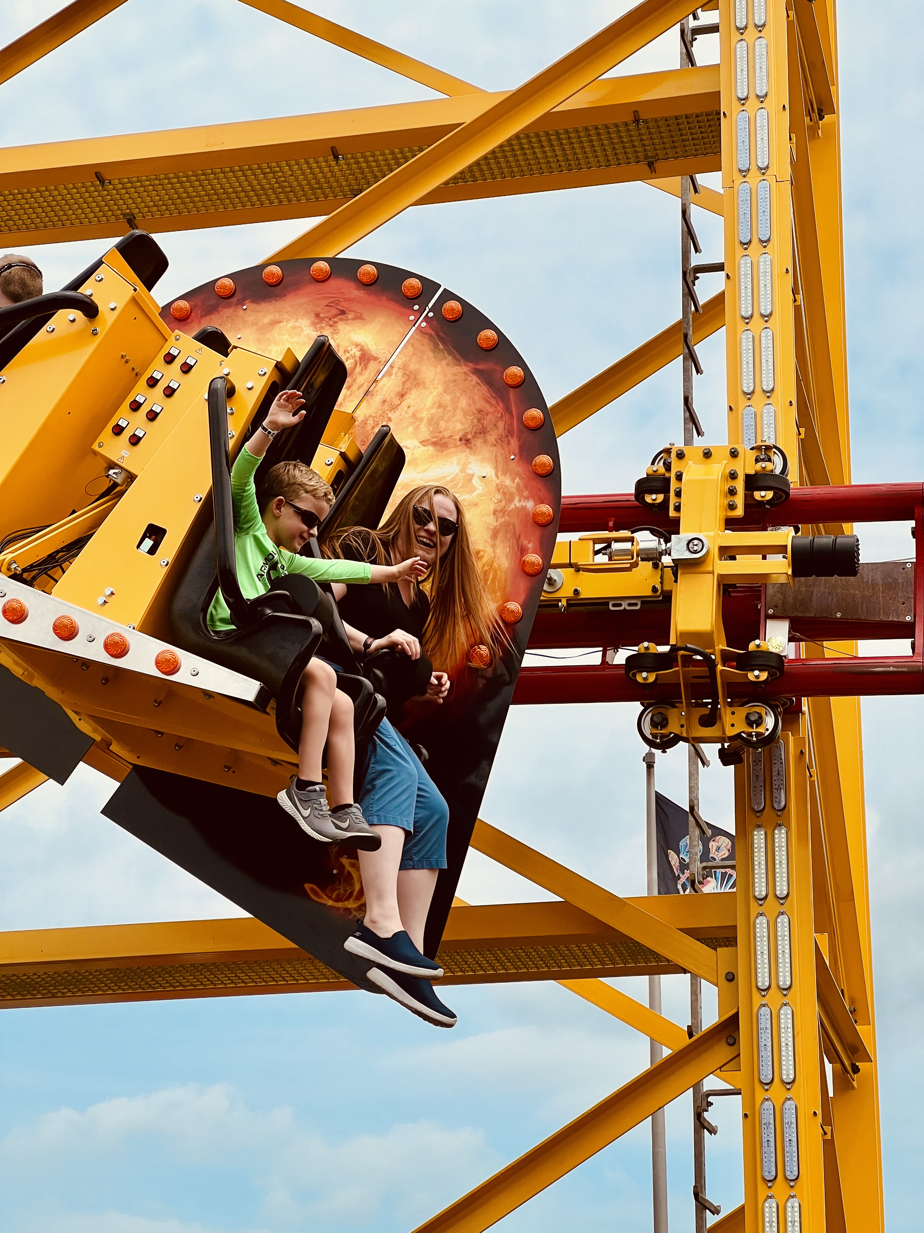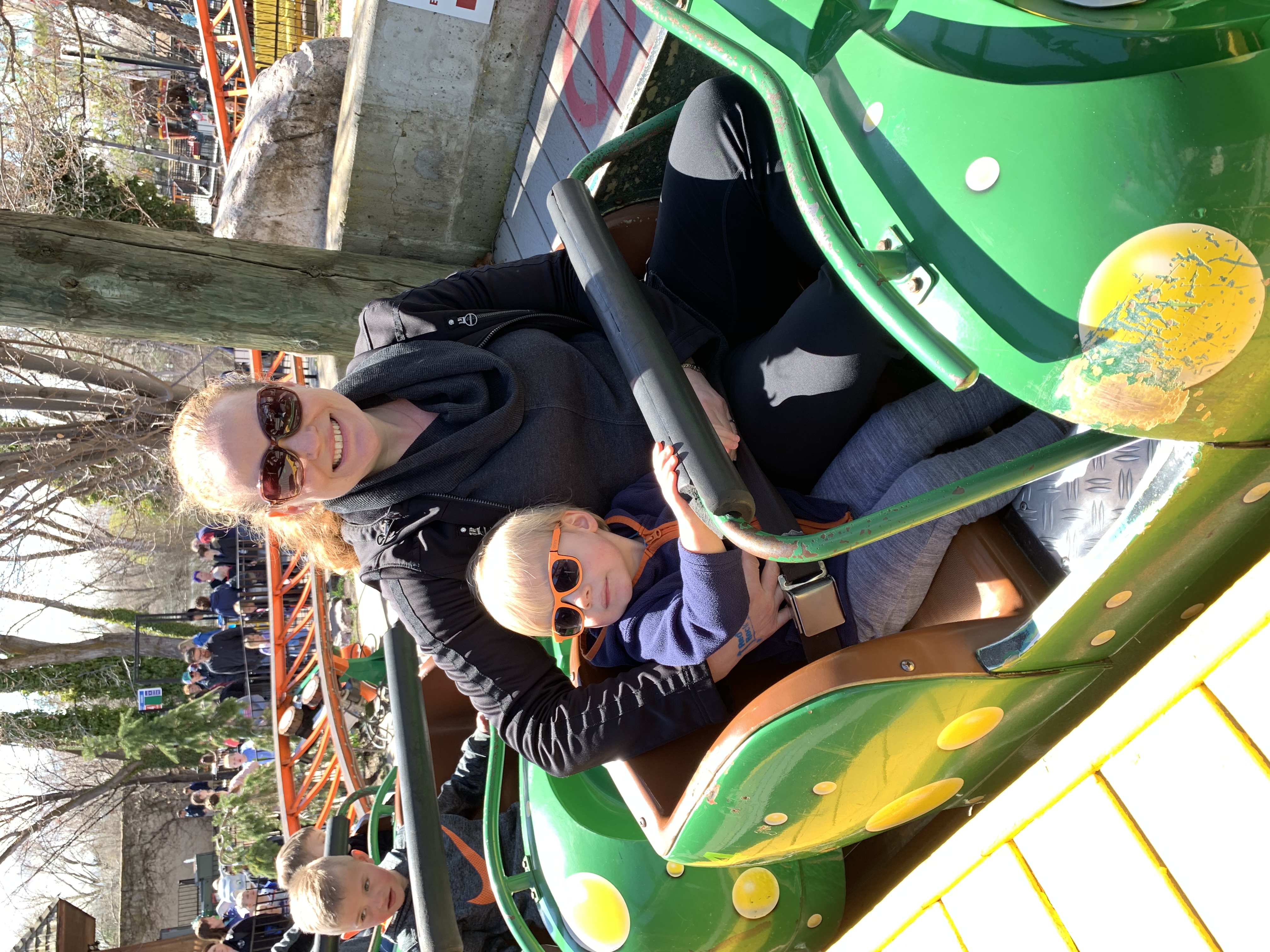 Aimee and her son Mason enjoying Puff the Little Fire Dragon together (Lagoon Amusement Park) - Mason's very first roller coaster.