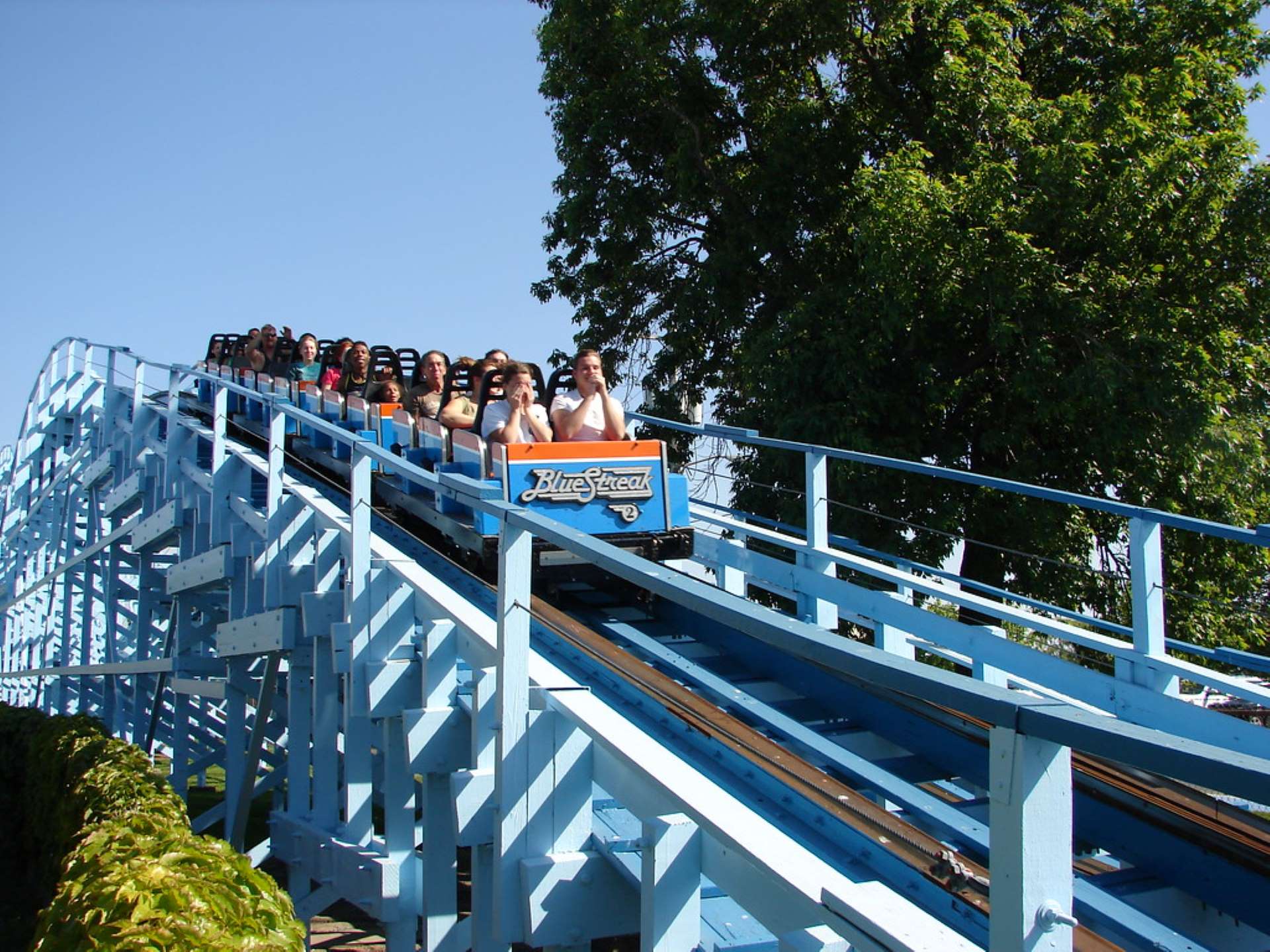 Located near the park’s main entrance and marina, along Sandusky Bay, Blue Streak opened on May 23, 1964. The coaster attains a maximum height of 78 feet and is capped off by a distinctively decorative cupula over the apex of the lift hill. Reaching a maximum speed of 40 mph after descending its 72-foot first drop, the coaster includes several smaller bunny hop hills along its 2,558 feet of track. The iconic structure was originally natural wood in color but received its signature blue paint scheme in 1968.