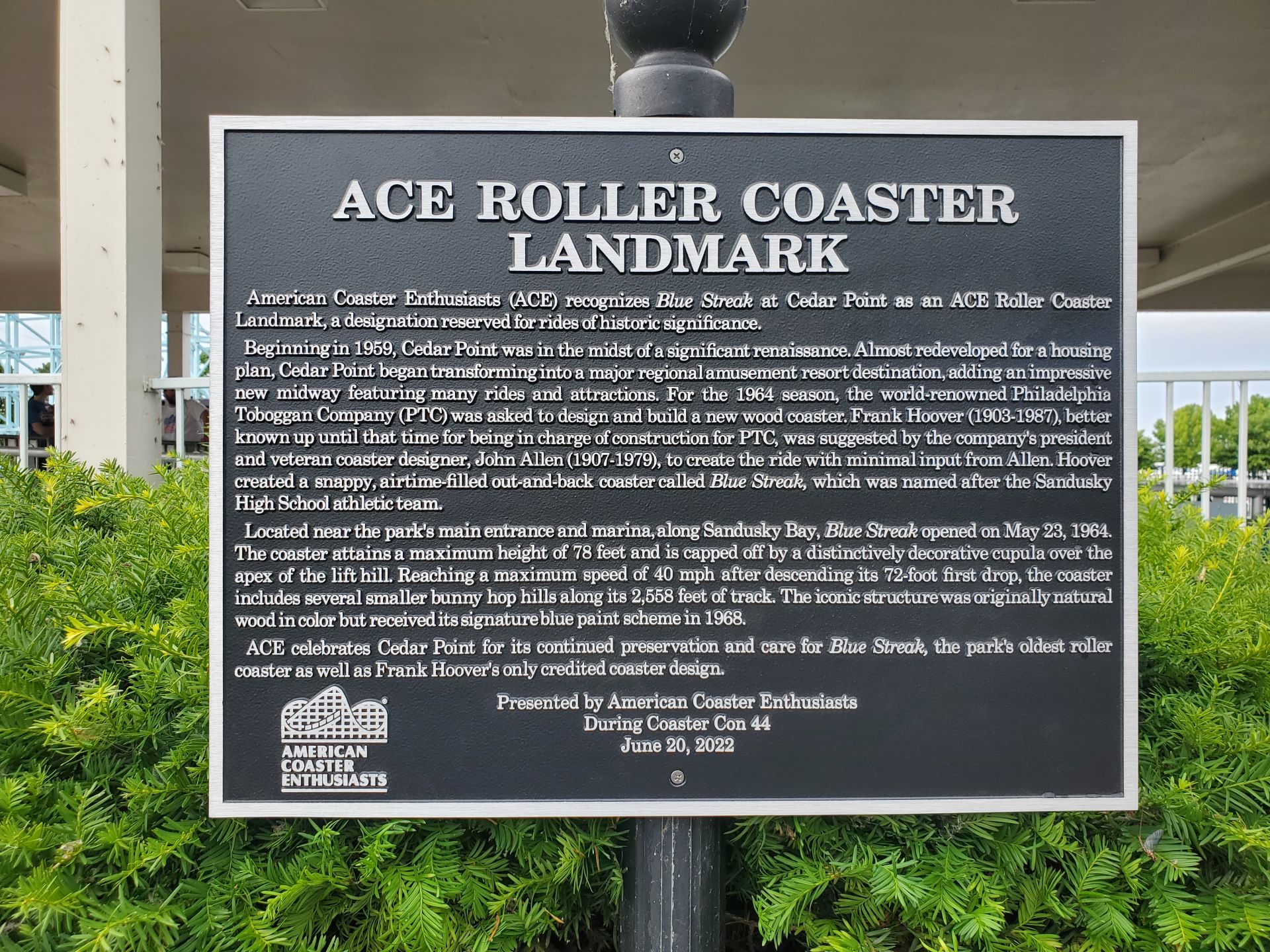 American Coaster Enthusiasts (ACE) recognizes Blue Streak at Cedar Point as an ACE Roller Coaster Landmark, a designation reserved for rides of historic significance.