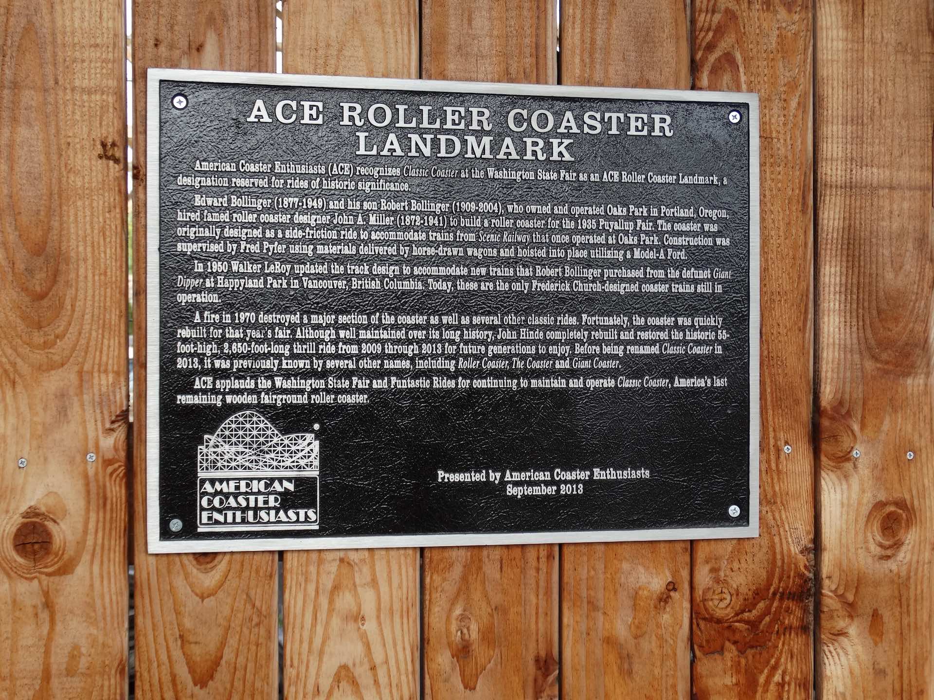 American Coaster Enthusiasts recognizes Classic Coaster at Washington State Fair as an ACE Roller Coaster Landmark, a designation reserved for rides of historical significance.