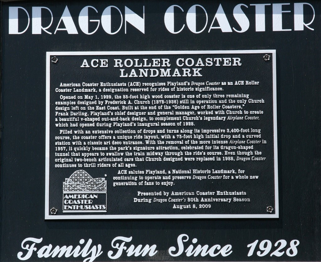 American Coaster Enthusiasts (ACE) recognizes Playland’s Dragon Coaster as an ACE Roller Coaster Landmark, a designation reserved for rides of historic significance.
