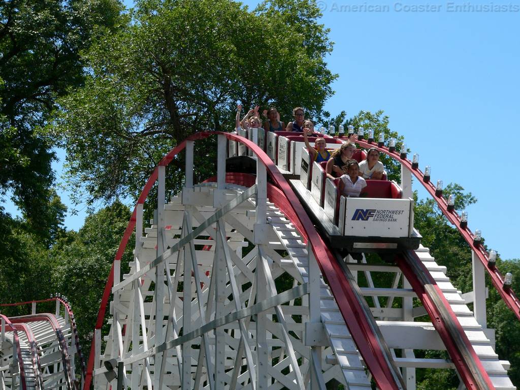In late 1987 the ride appeared lost with the closure of Arnolds Park (then Dickinson County Amusement Park). Fortunately, the efforts of local citizens and preservationists helped reopen the park in 1989, when John F. Pierce assisted in the rebuilding of the coaster. In the mid-1990’s it received both its name, as well as a new Philadelphia Toboggan Coasters train.