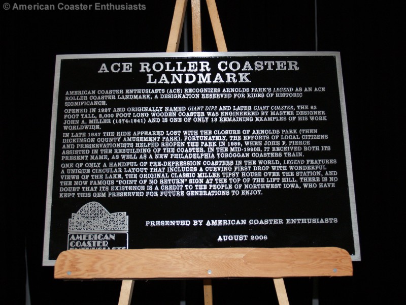American Coaster Enthusiasts (ACE) recognizes Arnolds Park’s Legend as an ACE Roller Coaster Landmark, a designation reserved for rides of historical significance.