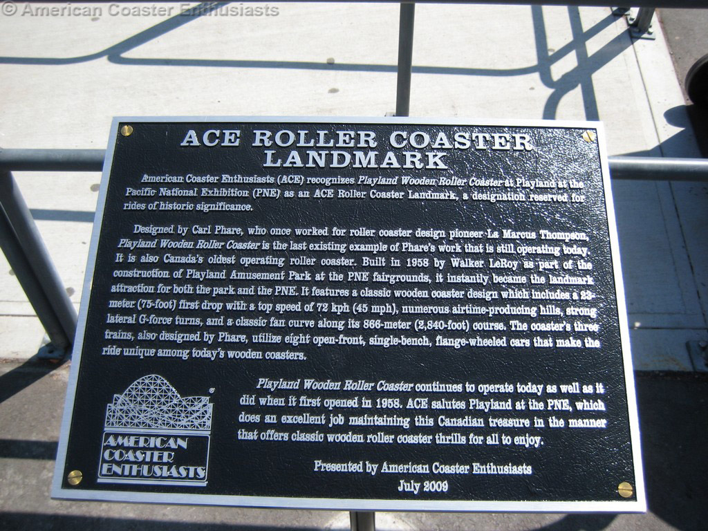 American Coaster Enthusiasts (ACE) recognizes Playland Wooden Roller Coaster at Playland at the Pacific National Exhibition (PNE) as an ACE Roller Coaster Landmark, a designation reserved for rides of historic significance.