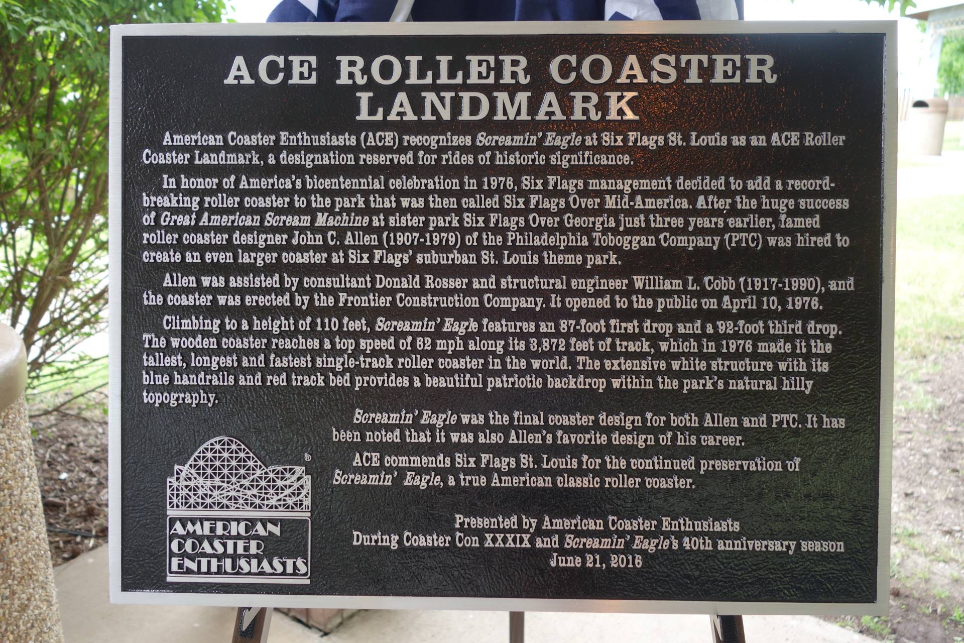 American Coaster Enthusiasts (ACE) recognizes Screamin' Eagle at Six Flags St. Louis as an ACE Roller Coaster Landmark, a designation reserved for rides of historic significance.