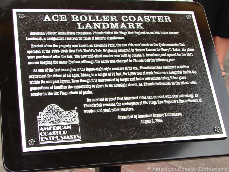 American Coaster Enthusiasts recognizes Thunderbolt at Six Flags New England as an ACE Roller Coaster Landmark, a designation reserved for rides of historic significance.
