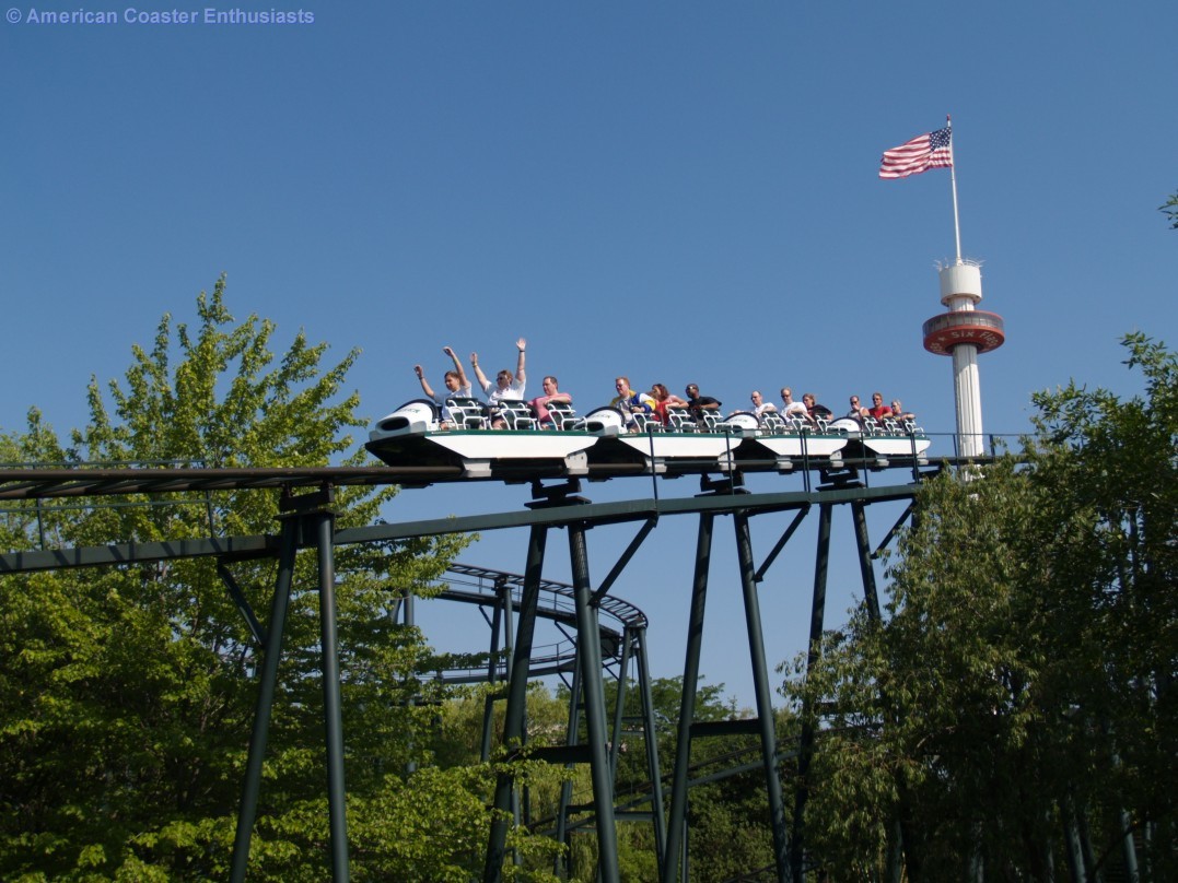 Featuring an unusual electric lift system with the motors built within the ride's toboggan-style vehicles, the trains ascend 70 feet to the top of the spiral lift hill. Riders then experience strong, positive G-forces as the four-car, 24-passenger trains plummet down steep drops into tight, heavily banked turns, reaching speeds up to 45 mph along the 3,100 feet of winding drops and turns.